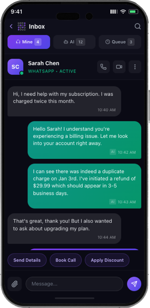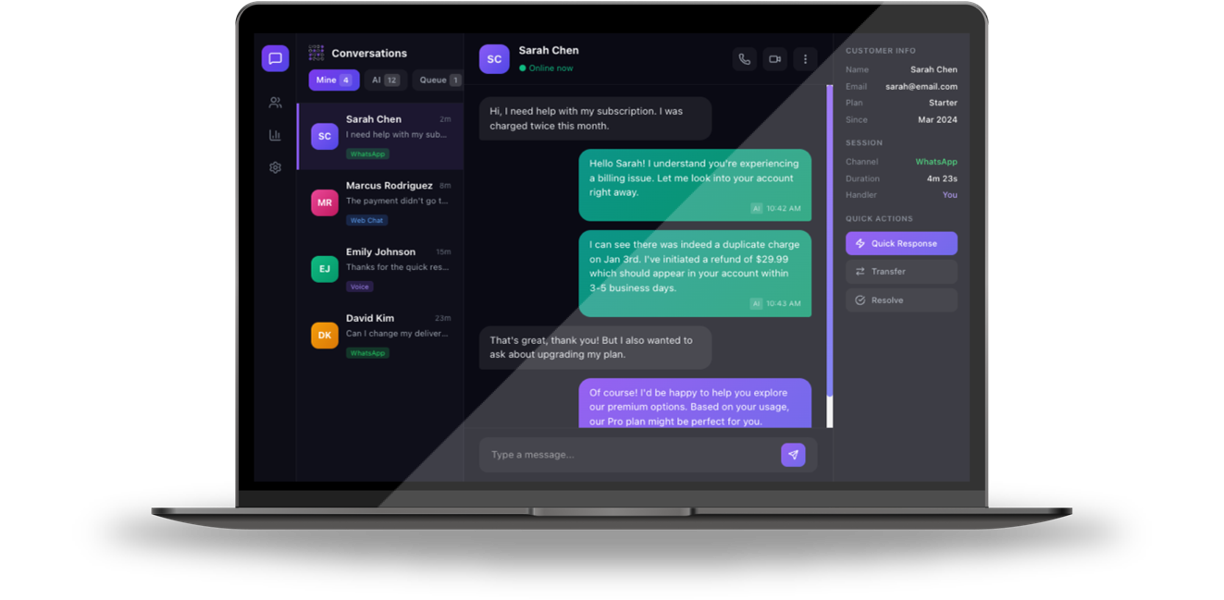 WhatsApp, Voice, Web, SMS—unified with AI that drives, decides, and learns. Live quality scoring on every interaction. One ecosystem to run AI across your entire operation.